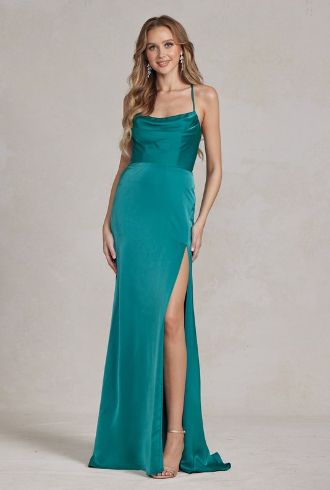 The chic cowl neckline adds a hint of mystique and fascination.