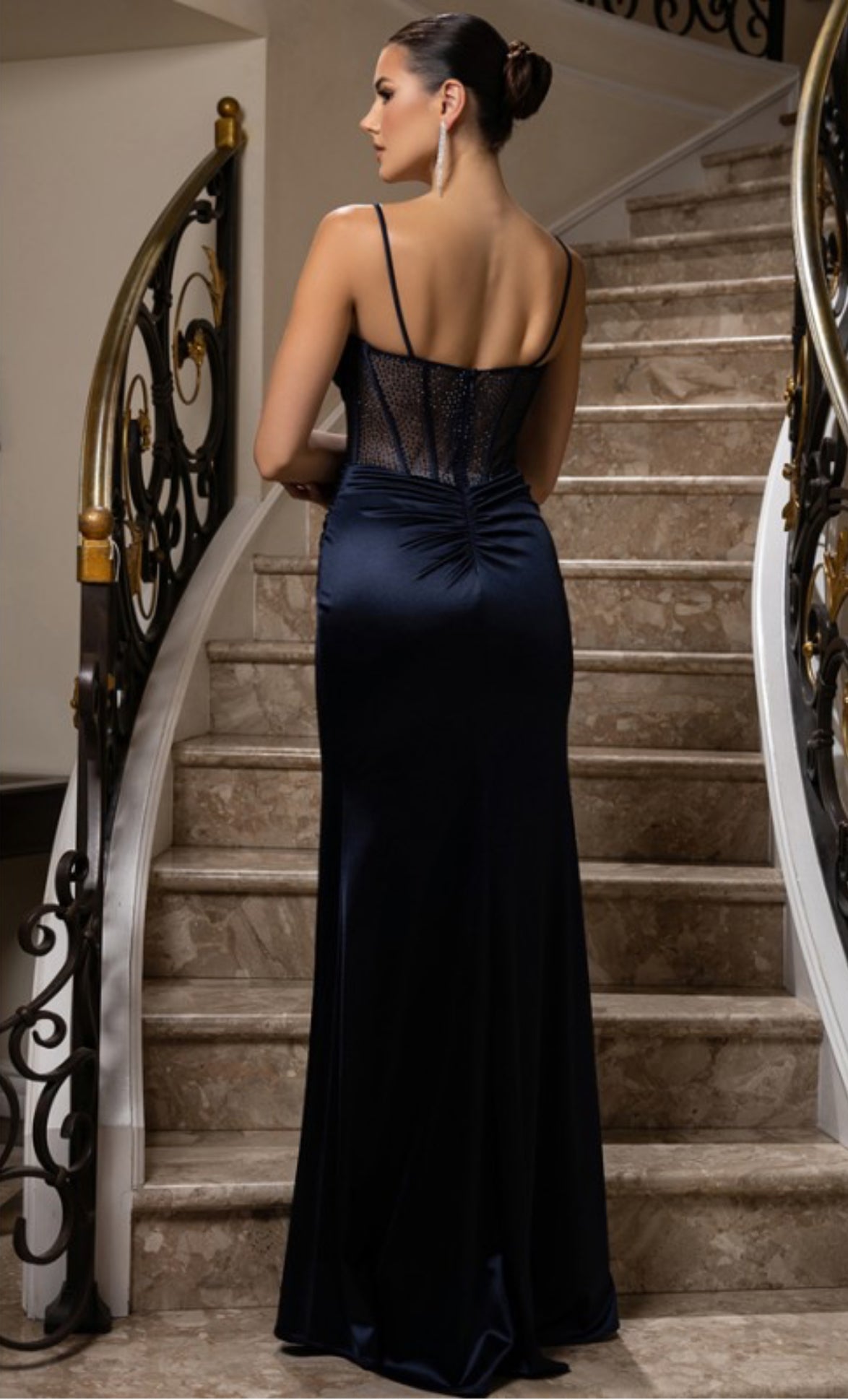 Features: Illusion Design, Bone in Bodice, Spaghetti Straps, Ruched Back, Zipper Closure.