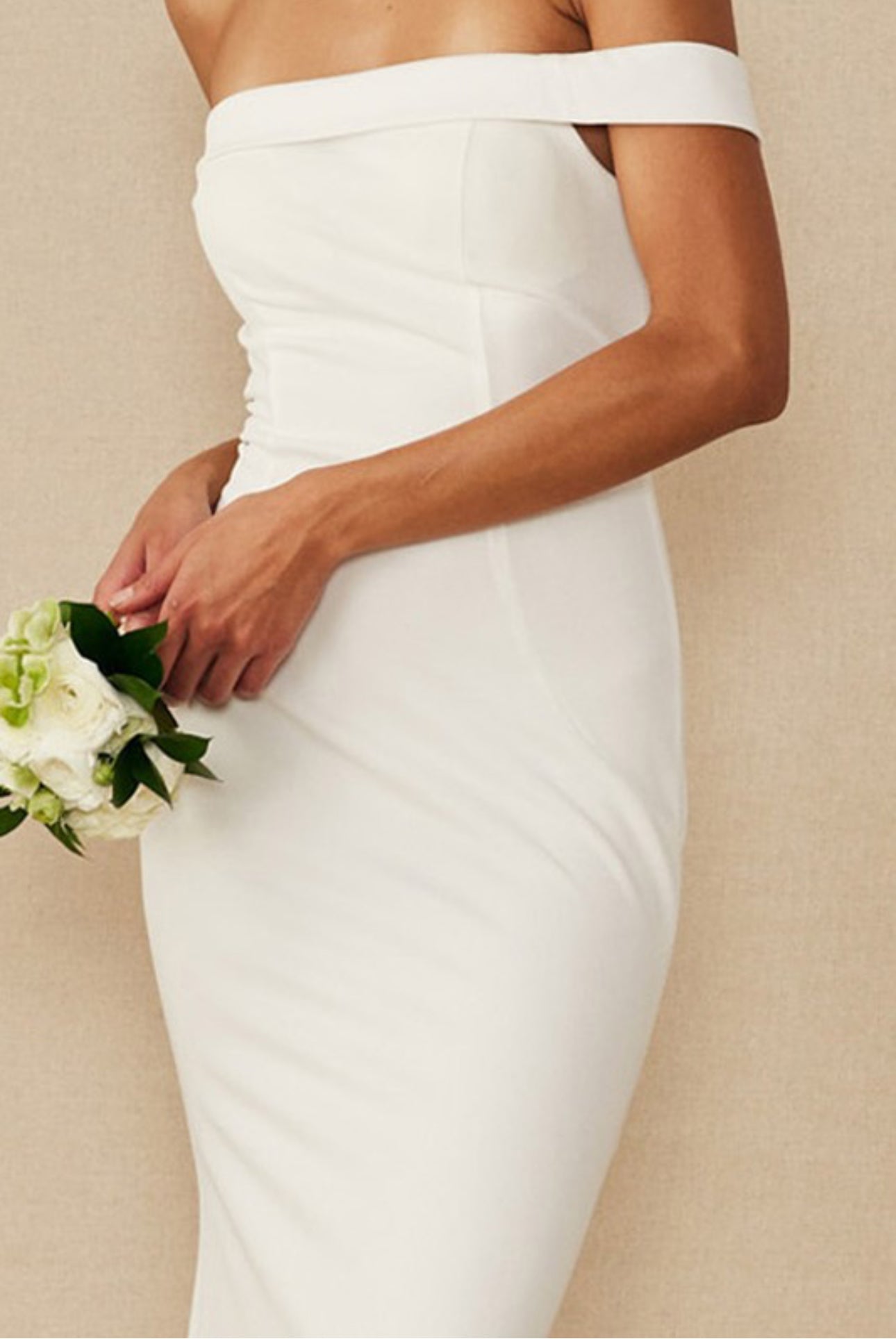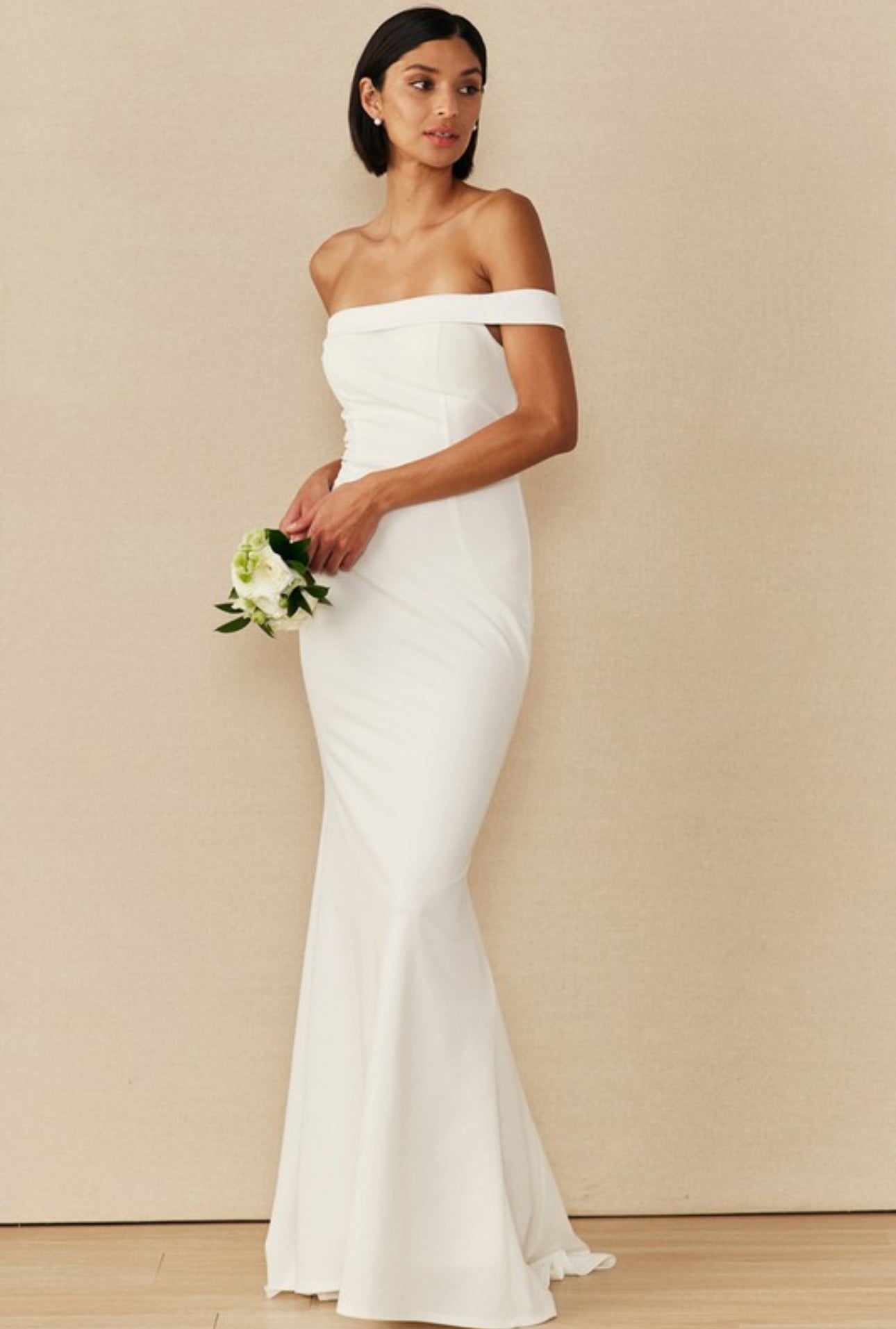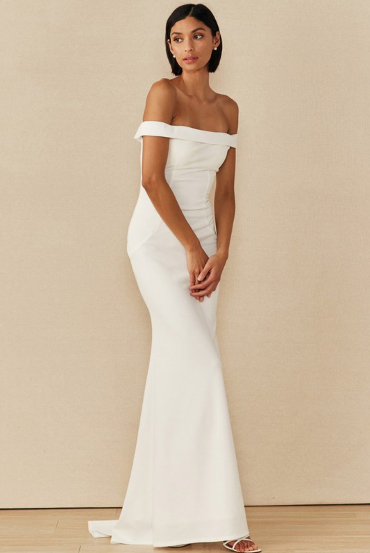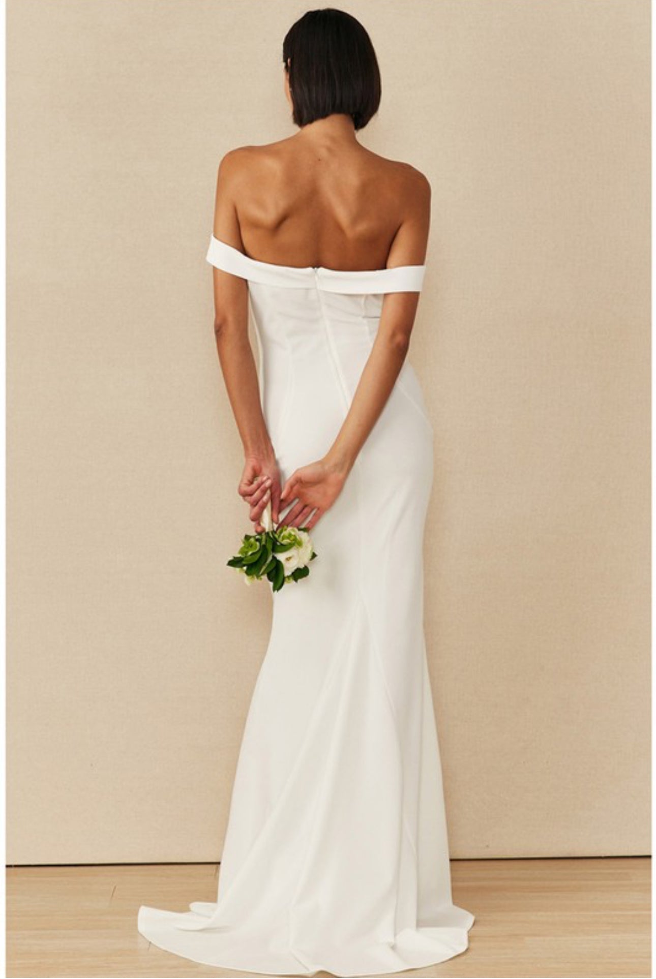 Off Shoulder, Fold Over Top Solid Mermaid Gown.