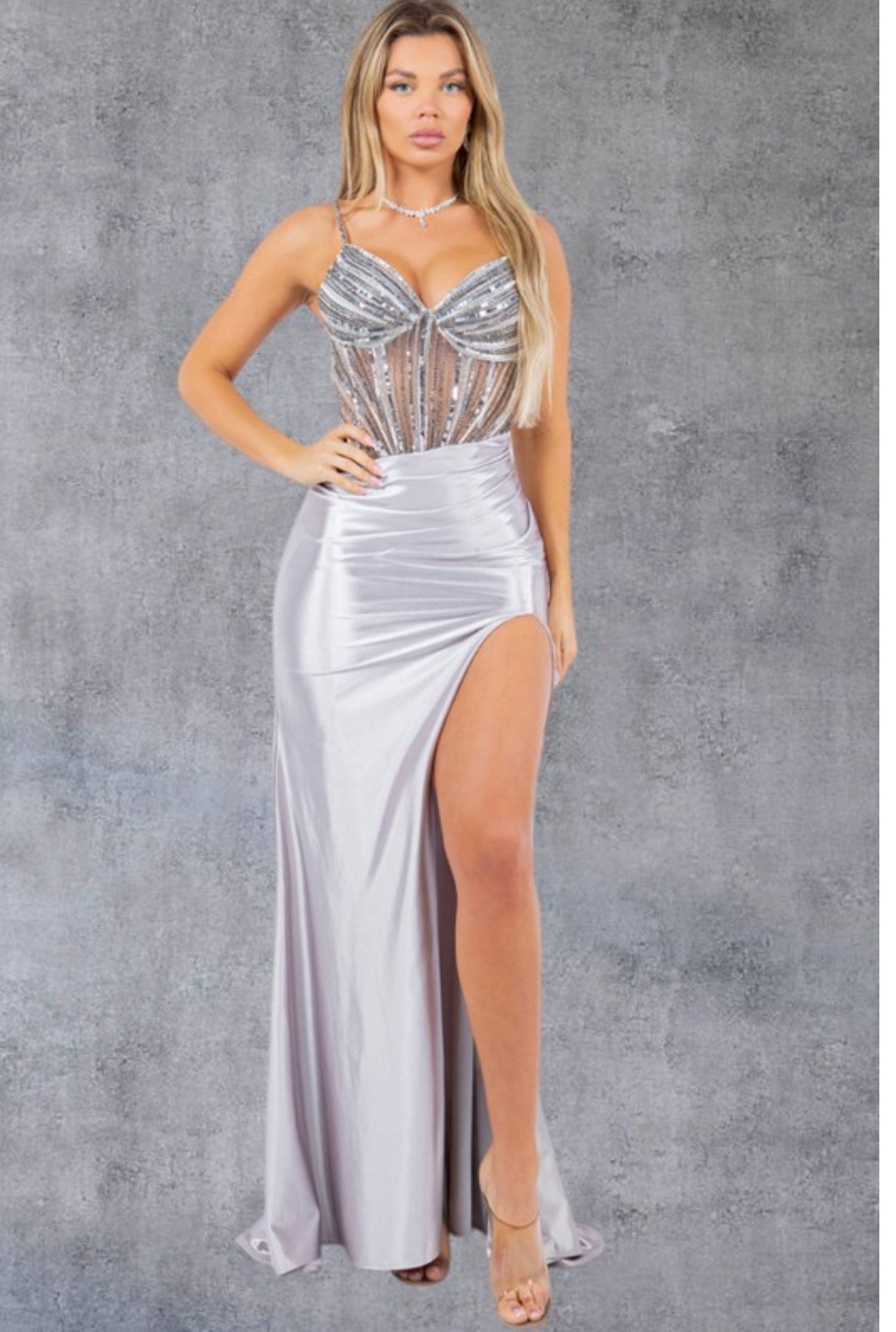 Look unforgettable in this embroidered sequin V-neck corset dress with fitted slit skirt. This gorgeous short sleeveless dress features sparkly sequin details and a V-neckline with thin straps.